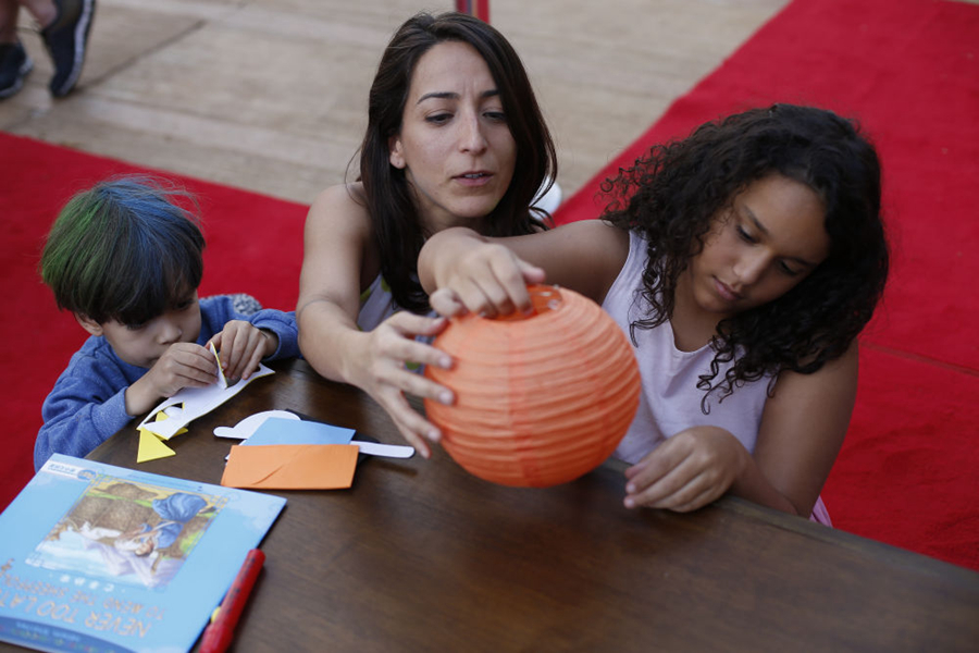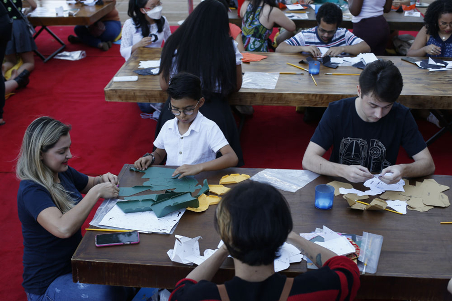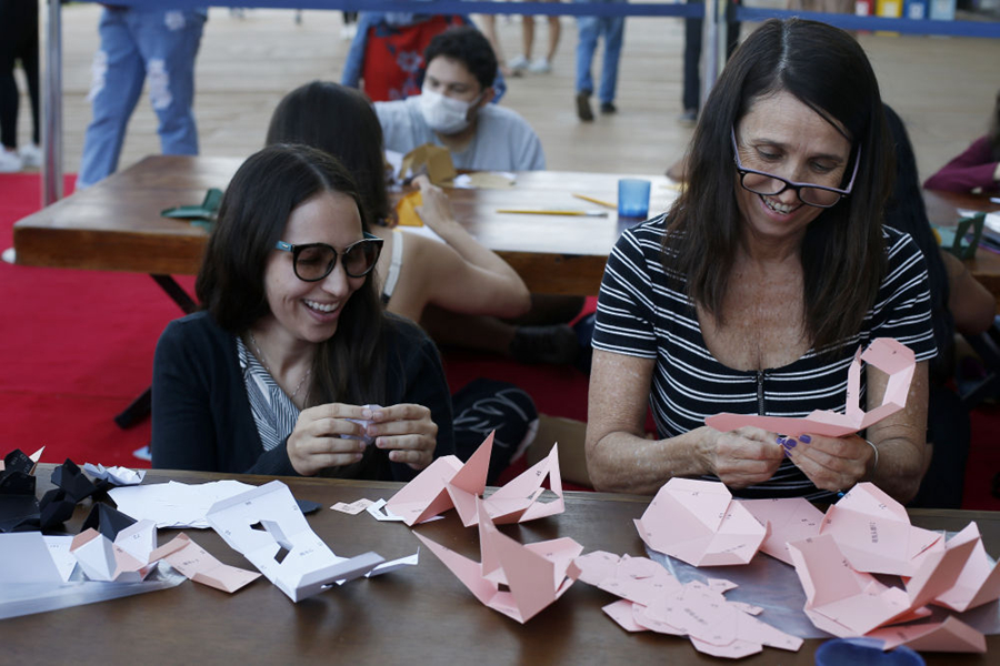 ↑8月13日,在巴西首都巴西利亚举办的“中国一瞬”文化体验周活动上,人们参加折纸体验活动。新华社发(卢西奥·塔沃拉摄)
