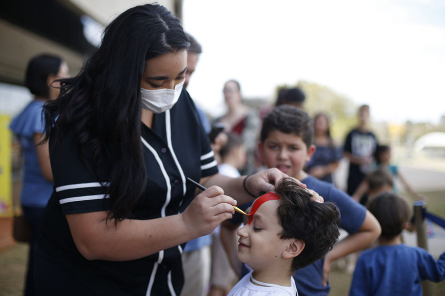 ↑8月13日,在巴西首都巴西利亚举办的“中国一瞬”文化体验周活动上,一名男孩体验面部彩绘。新华社发(卢西奥·塔沃拉摄)