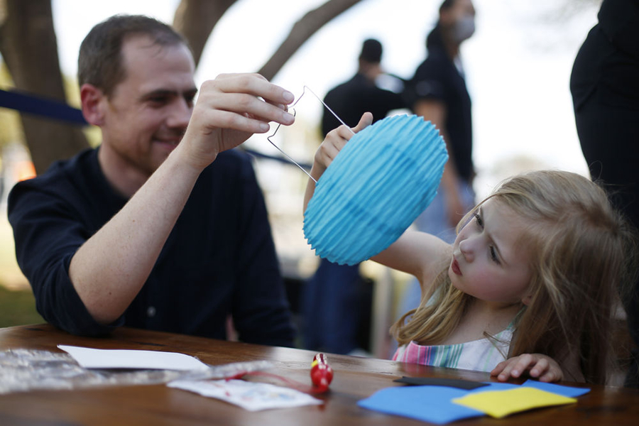↑8月13日,在巴西首都巴西利亚举办的“中国一瞬”文化体验周活动上,人们参加灯笼制作体验活动。新华社发(卢西奥·塔沃拉摄)