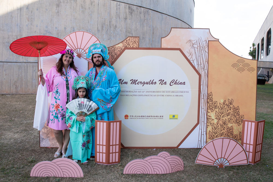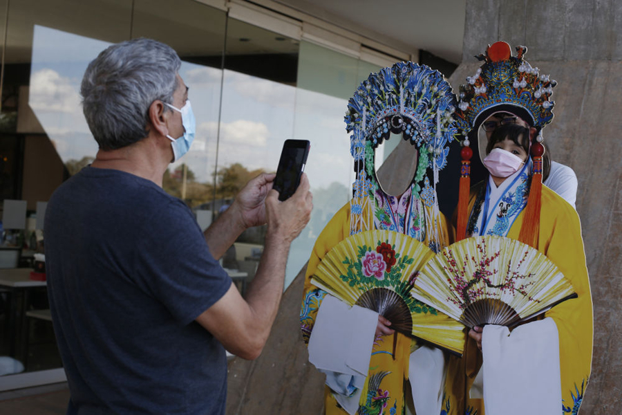 ↑8月13日,人们在巴西首都巴西利亚举办的“中国一瞬”文化体验周活动上拍照留念。新华社发(卢西奥·塔沃拉摄)