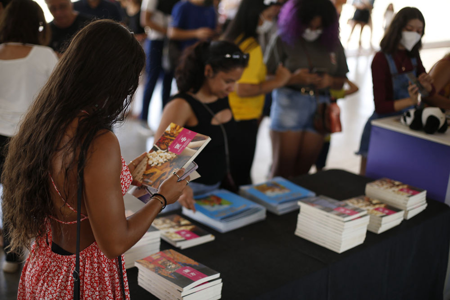 ↑8月13日,在巴西首都巴西利亚举办的“中国一瞬”文化体验周活动上,一名女子查看一本介绍中医的书籍。新华社发(卢西奥·塔沃拉摄)