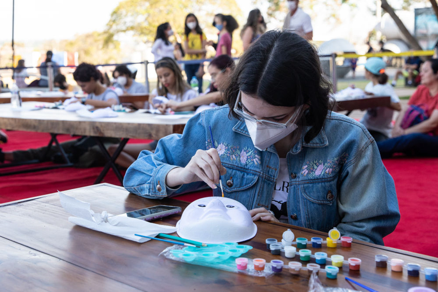 ↑8月13日,在巴西首都巴西利亚举办的“中国一瞬”文化体验周活动上,人们参加脸谱彩绘体验活动。新华社记者 王天聪 摄