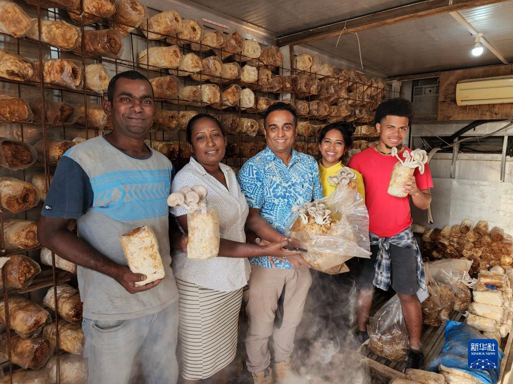 5月11日,在斐济第三大城市楠迪,一家斐济蘑菇公司员工展示在中国援斐菌草技术示范中心项目帮助下种植的蘑菇。新华社记者 张永兴 摄