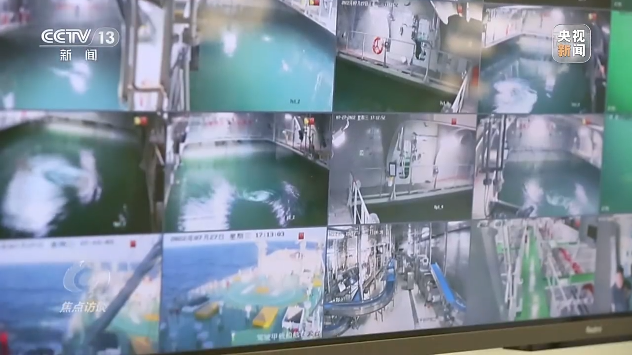 在养殖监控室,工作人员可以通过屏幕监控全船的氧气系统、投饲系统、养殖海水、养殖光照等各类系统运作情况,实时监测养殖舱内水体的温度、盐度、溶解氧和酸碱度。