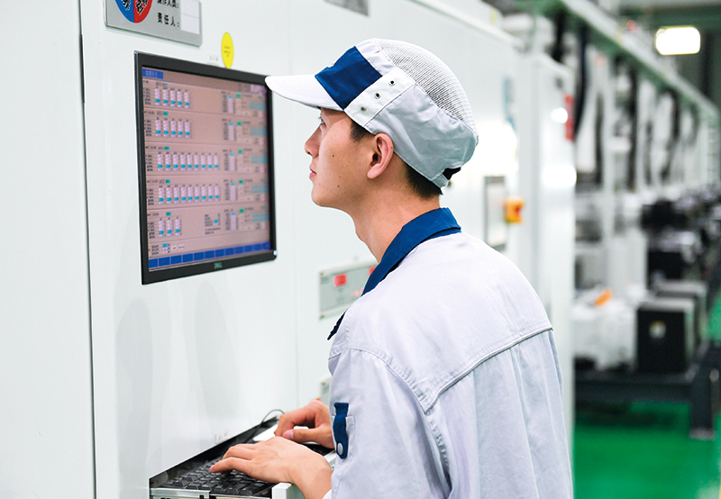 在位于浙江省绍兴市越城区的绍兴三花新能源汽车部件产业园,员工操纵智能零部件真空焊接设备(2022 年 8 月 2 日摄) 翁忻旸摄