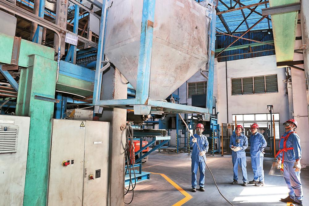 图为工人在贵金属二次资源物料回收生产车间作业。