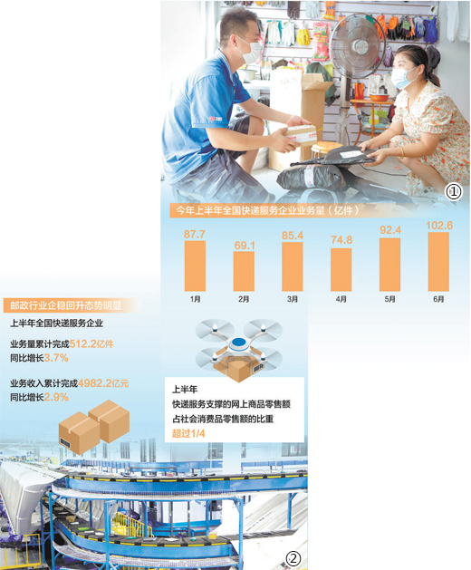 3月份,快递业日均业务量为2.75亿件;4月10日,受国内疫情多点散发影响,业务量降至2.42亿件;5月6日,随着一系列物流保通保畅政策出台落地,业务量迅速恢复至3.15亿件……上半年,我国快递业务量达512.2亿件,同比增长3.7%,快递服务支撑的网上商品零售额占社会消费品零售额的比重超过1/4。