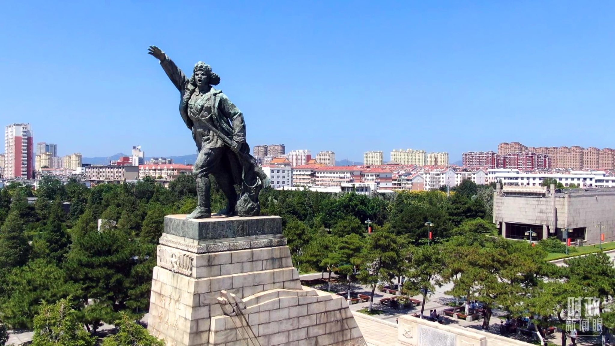△辽沈战役革命烈士纪念塔,塔身高8米,塔顶是一座持枪振臂呐喊的解放军战士全身塑像。(总台央视记者范凯拍摄)