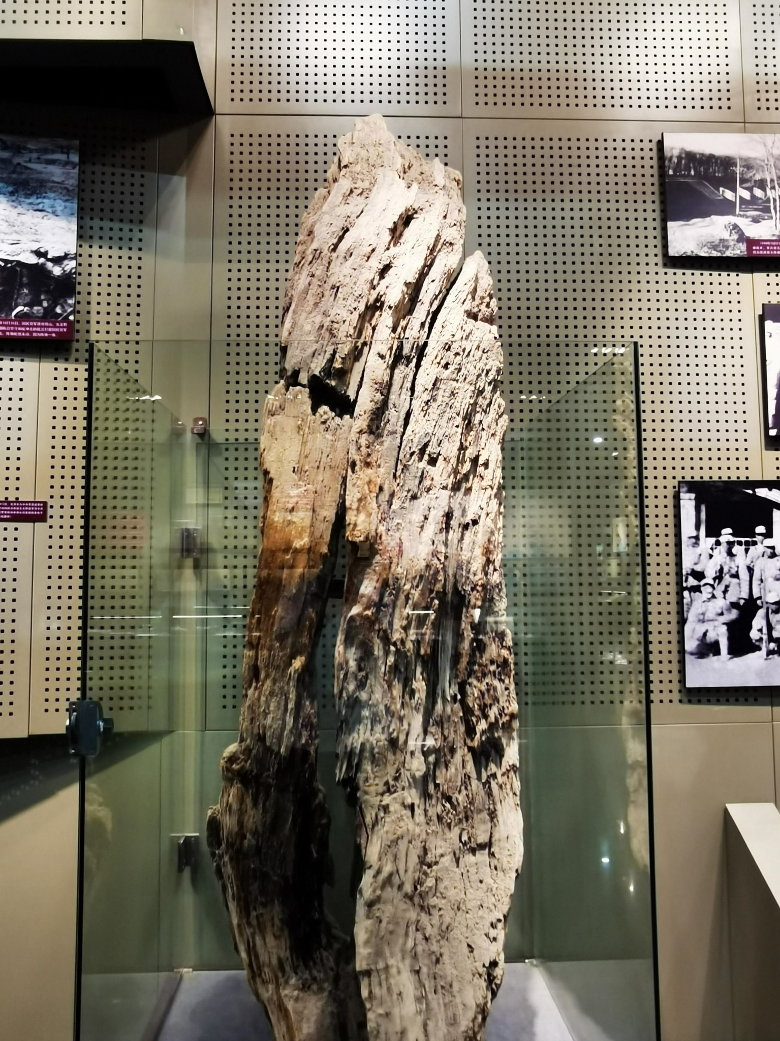△辽沈战役纪念馆中的“塔山英雄树”。它本是塔山地区一棵枝繁叶茂的大榆树,当地地势平坦,战士们就是以这棵大树作为掩体,击退了国民党军的一次次进攻。如今,这棵“英雄树”上布满了弹孔和烧痕。(总台央视记者石伟明拍摄)