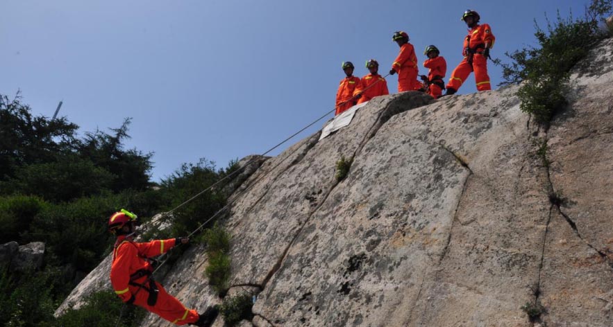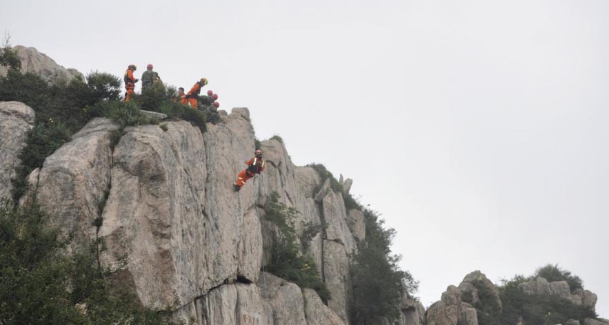 泰山消防救援站利用泰山地势,在瞻鲁台开展山岳救助训练。受访单位供图