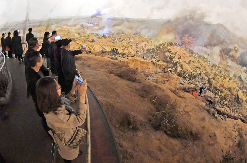 ↑观众在辽沈战役纪念馆全景画馆参观(2018年4月11日摄)。