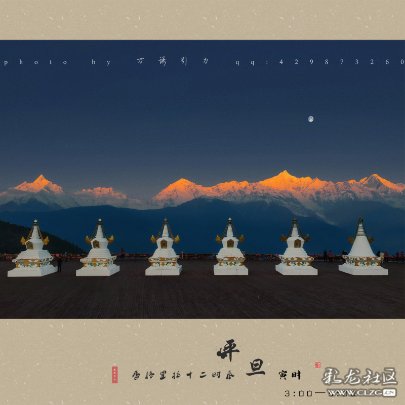 3、寅时,平旦。熬过了最黑的夜,终于迎来了新的光明与希望。天空披上了一缕殷红的面纱,阳光从卡瓦格博主峰的顶端慢慢洒满金色,从皎月落下一直到金光映照在圣山,整个的过程让人心生敬畏,面对梦幻般的壮丽景观,令人每分每秒都屏住了呼吸。