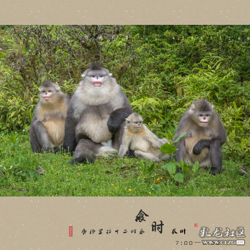 5、辰时,食时。温暖的阳光照耀山谷,山中云杉、冷杉等针叶树的嫩芽及松萝、竹笋等都是香格里拉滇金丝猴国家公园里的猴群们喜欢的食物。可爱的一家四口开始了一天的进食和嬉戏。