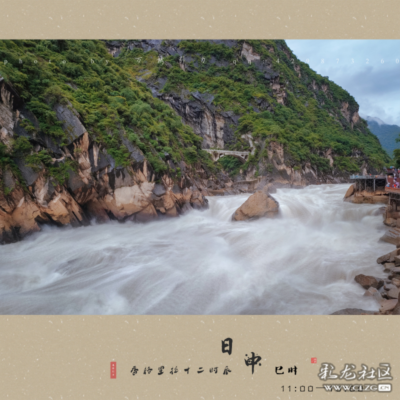 7、午时,日中。太阳正运行到天宇之中,光线强烈,阳气达到顶点。虎跳峡中雷霆轰鸣,声震山谷,似猛虎狂啸,震天撼地,夺人心魄、令人敬畏的大自然雄峻壮美。