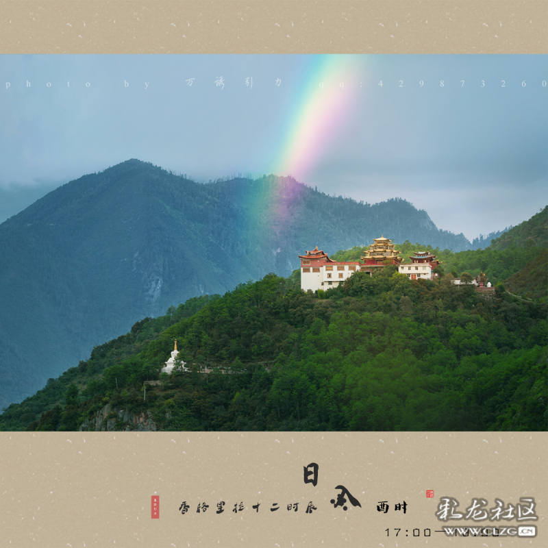 10、酉时,日入。塔城达摩寺建在海拔3000米悬崖峭壁上,凿石架木,叠木成寺,雄险奇丽,匠心独到。暮下远空飞虹,万仞山中古刹,空灵飘逸。