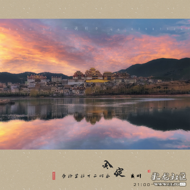 12、亥时,入定。日暮西沉,晚霞布满松赞林寺的整片天空,野鸭在瑰丽的霞光中展翅飞翔,秋水与长天连成一片,青天碧水,天水相接,上下浑然一色,彩霞与孤鹜起飞,与秋日的金色大殿相映增辉。广阔天地的一切都做好偃旗息鼓的准备,浪漫和静谧夜晚即将拉开帷幕。