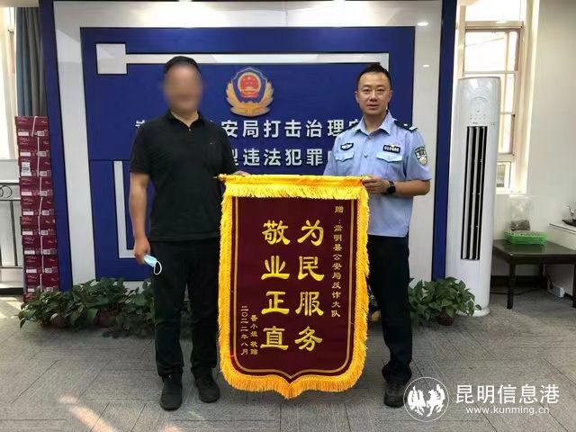 昆明信息港讯 记者合宇聪 “警察同志,谢谢你们!为我挽回了那么多损失,以后我一定提高警惕,不断提升自己防范电信网络诈骗的能力!”8月16日,家住嵩明县杨林镇的香女士及家属将一面印有“为民服务 敬业正直”的锦旗,送到嵩明县公安局反诈中心民警手中,感谢民警及时为其挽回损失8万余元。回忆起当时被骗的场景香女士仍心有余悸……