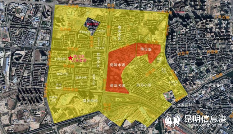 8月17日,昆明市西山区应对新型冠状病毒感染肺炎疫情工作领导小组指挥部发布通告,从2022年8月18日零点开始,对人民西路-海源南路-碧鸡路-明河路-大观路-西园北路-人民西路区域实施静态管理,3天3检。其中,区域里还有一个核心区(红色部分),包括整个海伦堡(中央广场)、和平海鲜农贸市场、碧鸡名城,做到7天7检。