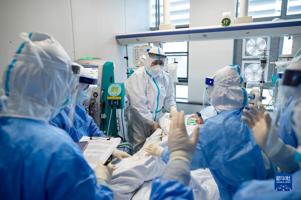在华中科技大学同济医学院附属同济医院中法新城院区ICU病房,北京协和医院内科重症医学科主任杜斌(中)带领医疗团队查看一名新冠肺炎危重症患者情况(2020年4月11日摄)。新华社记者 沈伯韩 摄