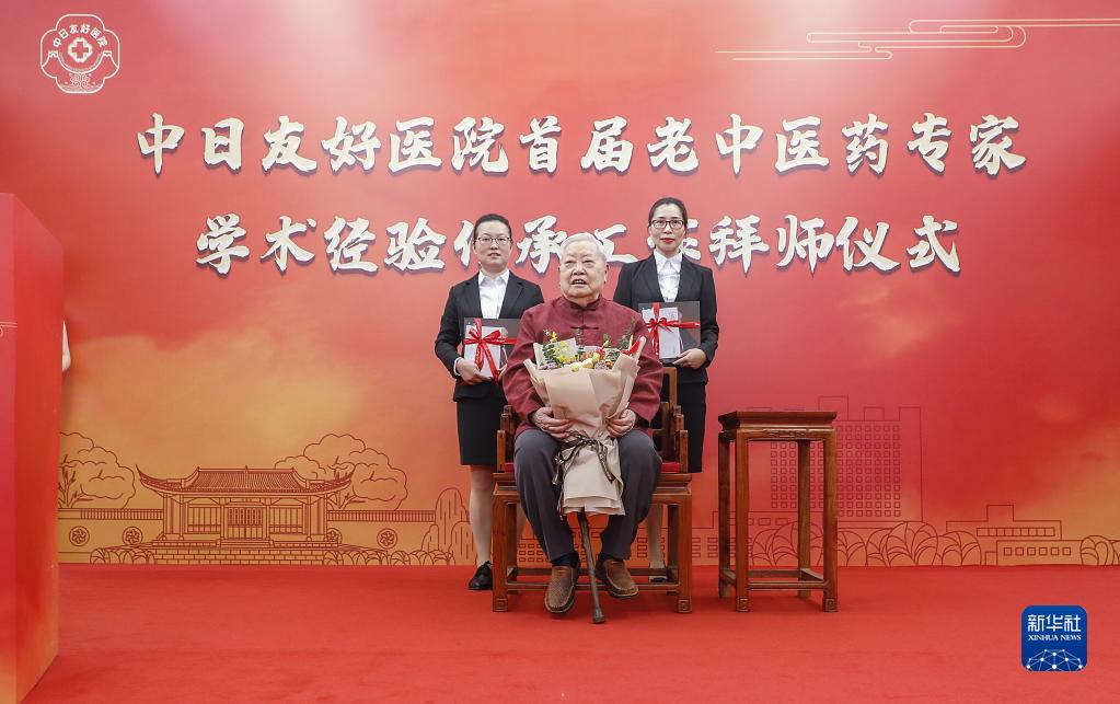 2021年9月16日,中日友好医院在北京举行首届老中医药专家学术经验传承工作拜师仪式。国医大师许润三和传承人在拜师仪式上合影。新华社记者 张玉薇 摄
