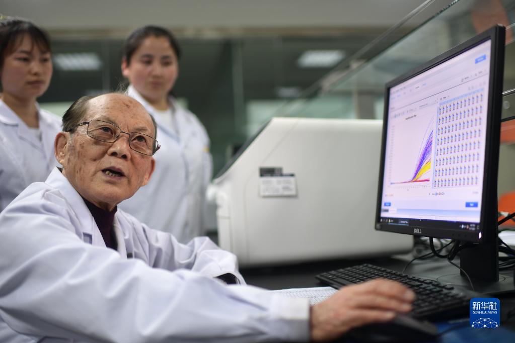 吴天一(前)在青海西宁的实验室内和学生讨论(2021年6月17日摄)。新华社记者 张宏祥 摄