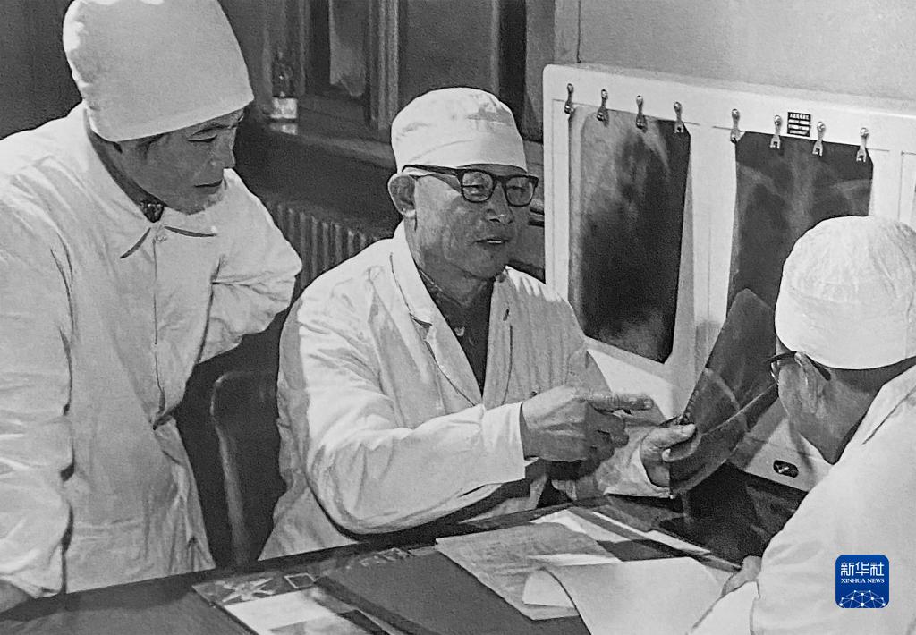 1980年1月16日,辛育龄(中)在内蒙古结核病院与胸外科医师讨论病例(翻拍照片)。新华社发