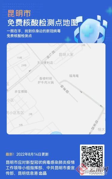 8月13日,昆明市疫情防控指挥部办公室明确,继续延长社会面免费核酸检测时间。全市各县(市)区、开发(度假)区免费核酸检测点位不减,本次时间延长为8月16日至8月31日。这是今年4月以来,昆明第9次延长免费检测时间。群众可用手机扫一扫这份《昆明市免费核酸检测点地图》,找到离您最近的免费核酸检测点。