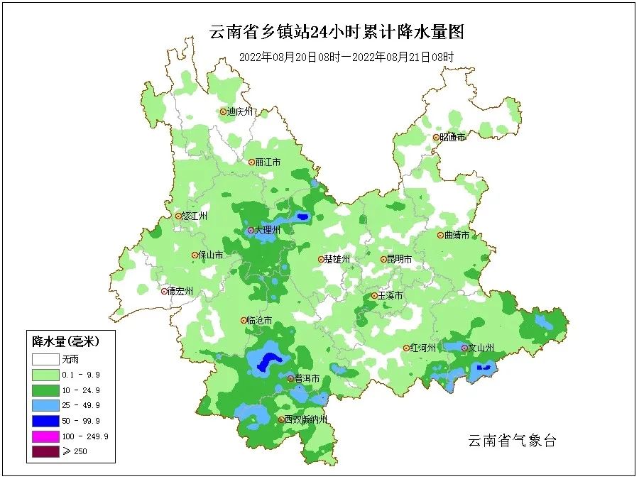怒江、大理西部、保山、德宏、临沧、普洱、西双版纳、红河南部、文山南部多云有阵雨局部中雨,其他地区多云间晴。