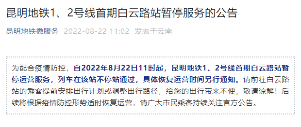 22日,据昆明地铁微服务微信公号消息,为配合疫情防控,自2022年8月22日11时起,昆明地铁1、2号线首期白云路站暂停运营服务,列车在该站不停站通过,具体恢复运营时间另行通知。