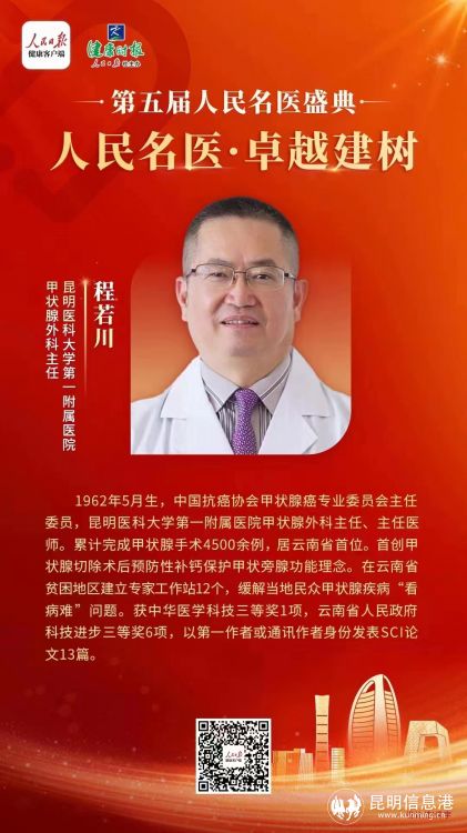 8月22日,记者从昆明医科大学第一附属医院获悉,云南省甲状腺外科临床研究中心、昆明医科大学第一附属医院(下称昆医大附一院)甲状腺疾病诊治中心主任程若川教授入选“第五届人民名医·卓越建树”,获得主流媒体和业内的权威认可,成为云南省甲状腺行业第一人,标志着云南省甲状腺学科建设已经步入全国先进云南领先水平。