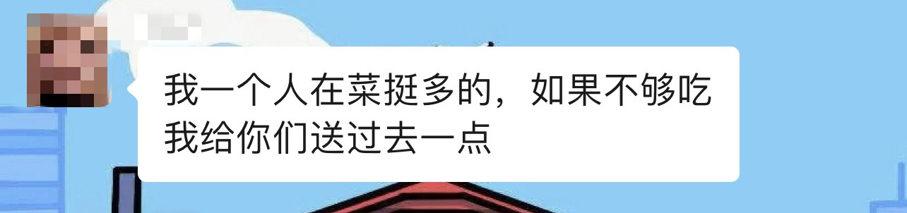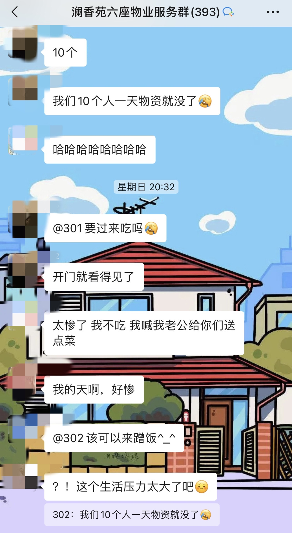 “一顿饭的事儿,有啥困难群里说一声,大家能帮也就帮了! ”12楼的邻居马上接过话茬,“我家里有一些肉和青菜,我放在楼道口,你们现在上来拿吧。”“我一个人菜挺多的,如果不够吃我给你们送过去一点。”25楼的邻居音音也在群里留言。