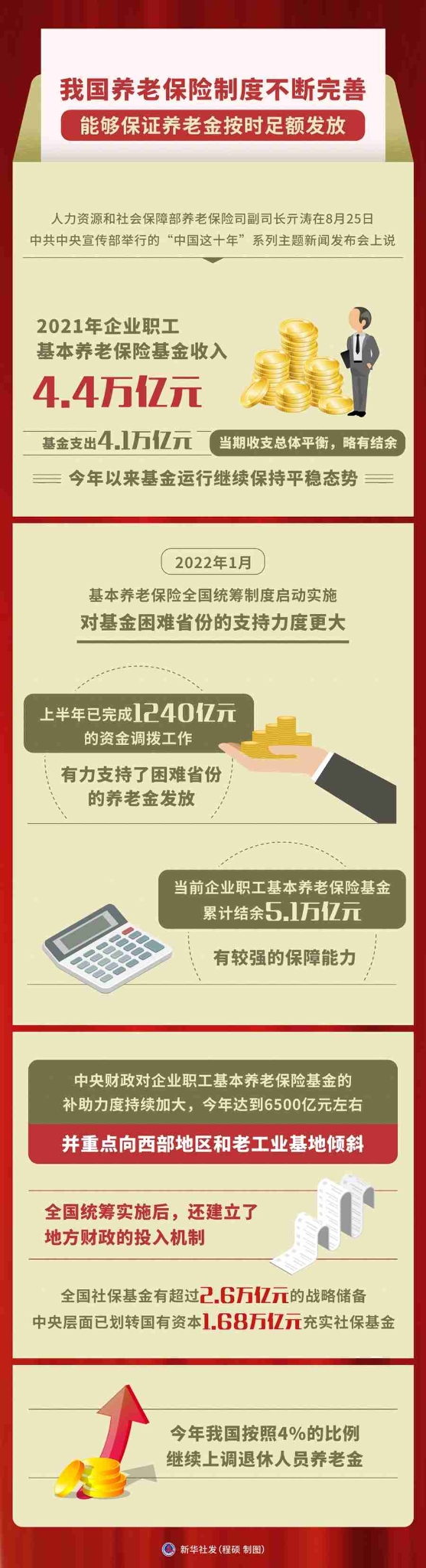 新华社北京8月25日电(记者姜琳 刘夏村)养老金关系亿万退休人员生活。人力资源和社会保障部养老保险司副司长亓涛25日表示,党的十八大以来,养老保险事业快速发展,积累了坚实物质基础,制度运行更加稳健,基金更可持续,能够保证养老金按时足额发放。亓涛在当天中共中央宣传部举行的“中国这十年”系列主题新闻发布会上说,2021年企业职工基本养老保险基金收入4.4万亿元,基金支出4.1万亿元,当期收支总体平衡,略有结余,今年以来基金运行继续保持平稳态势。今年1月,基本养老保险全国统筹制度启动实施,对基金困难省份的支持力度更大,上半年已完成1240亿元的资金调拨工作,有力支持了困难省份的养老金发放。当前企业职工基本养老保险基金累计结余5.1万亿元,有较强的保障能力。此外,财政有补助,长远有储备。中央财政对企业职工基本养老保险基金的补助力度持续加大,今年达到6500亿元左右,并重点向西部地区和老工业基地倾斜。全国统筹实施后,还建立了地方财政的投入机制。全国社保基金有超过2.6万亿元的战略储备,中央层面已划转国有资本1.68万亿元充实社保基金。今年我国按照4%的比例继续上调退休人员养老金。“目前,增发的养老金已发放到位。”亓涛说,“下一步,还将综合采取一系列措施,推动养老保险制度不断改革完善,促进制度更加公平更可持续,保证养老金的按时足额发放。”