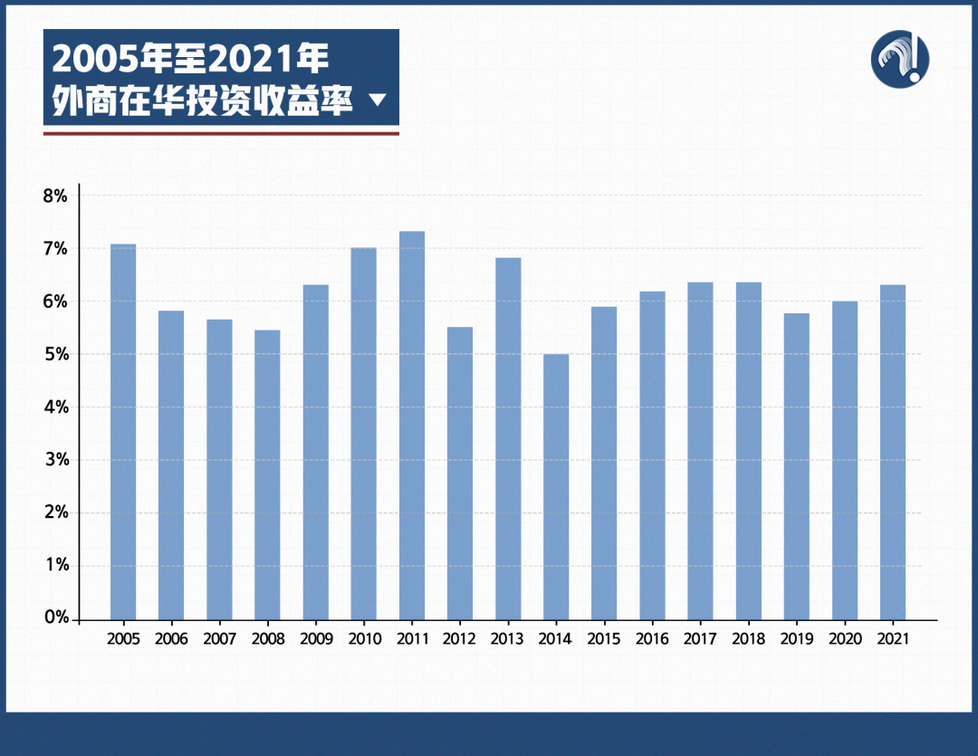 即便在新冠肺炎疫情期间,外商在华投资总体收益率依然在上升。2021年,外国投资者在中国投资,仍然能获得超6%的收益率。