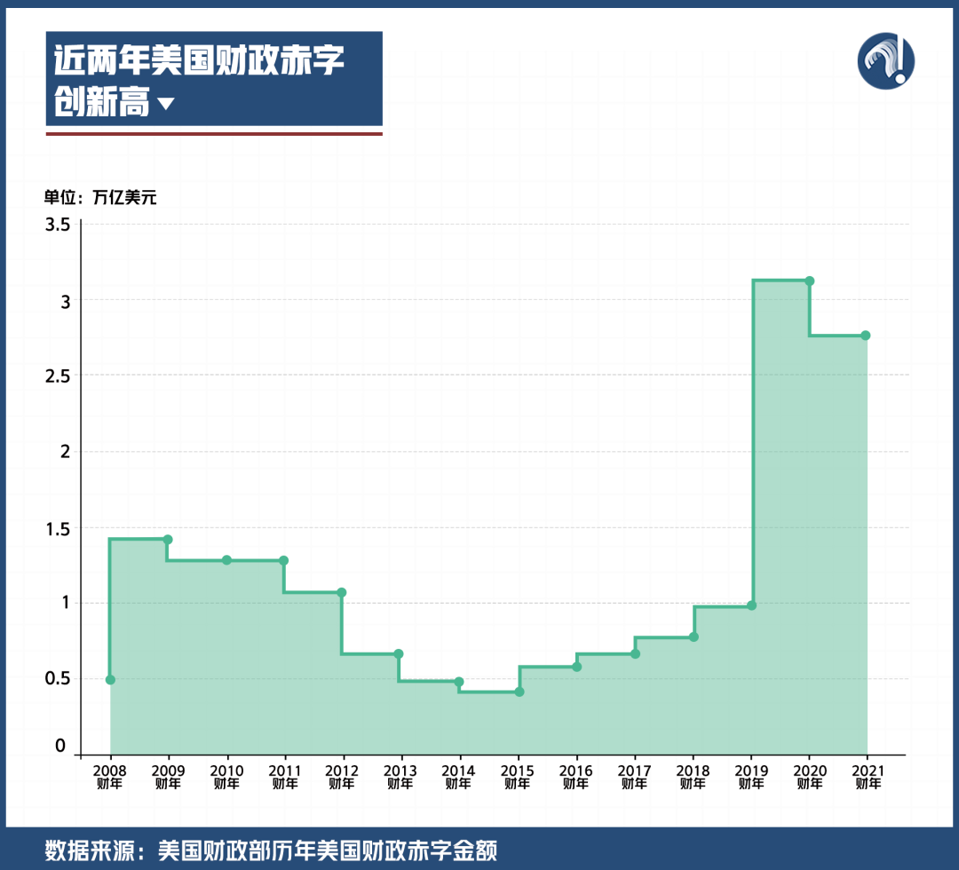 不仅如此,美国还多次出台大规模经济纾困法案,2021年财政赤字率达到了12.4%,甚至已经高于2009年金融危机期间9.8%的历史最高水平。
