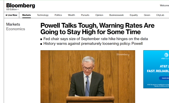 一些市场分析人士认为,鲍威尔最新的鹰派言论显示美联储将会在9月再次大幅加息,并压制了市场上一些认为通胀已经见顶、美联储将很快扭转货币政策方向的观点。在鲍威尔发表讲话前,三大股指大致持平,讲话后市场开始持续下跌,直至收盘时跌幅扩大。