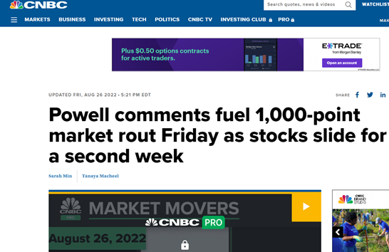 当地时间8月26日,美联储主席鲍威尔在杰克逊霍尔全球央行年会上表示,美联储将会继续加息,并在一段时间内维持较高利率,同时承认对抗通胀会给家庭和企业带来痛苦。此番言论被市场解读为释放鹰派信号,表明美联储将不惜以牺牲经济增长为代价对抗通胀。当日美股市场出现暴跌,道琼斯工业平均指数下跌超过1000点。