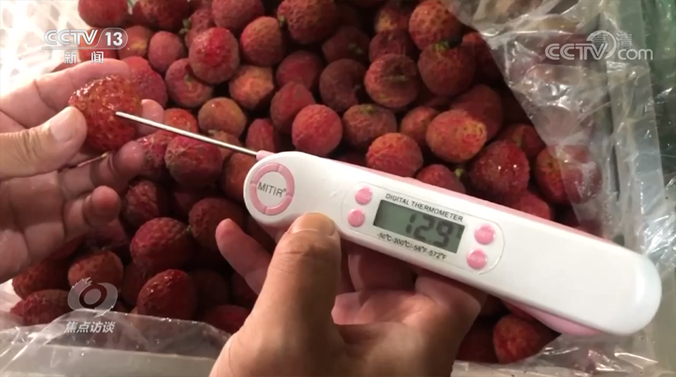 预冷成为保证优质荔枝从田间地头到餐桌的关键一步。尽管户外温度逼近40摄氏度,在荔枝园旁的这个2000平方米的冷库操作间里,每个人都穿上了棉袄。对刚刚采摘下来的荔枝进行分拣,荔枝只有在冷库内安静待上十个小时左右,才能将原本只有2到3天的保鲜期延长至一周。