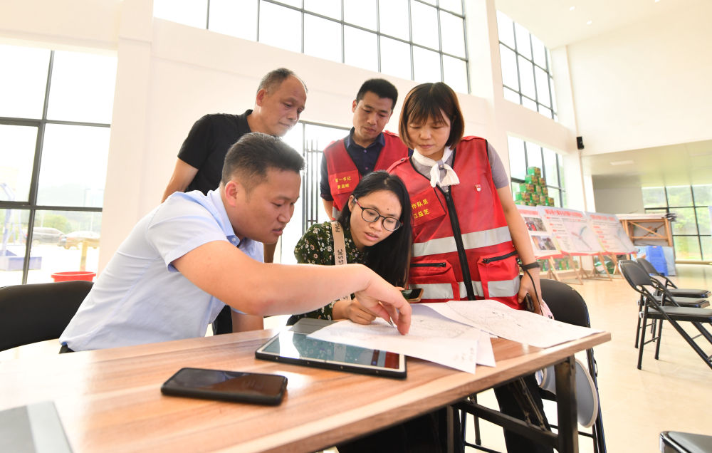 2022年5月6日,广西柳州市融安县大坡乡岗伟村驻村第一书记黄晨晖(后排右)和乡镇干部、工程设计人员在大坡飞鸡农特产品大数据中心讨论岗伟村产业示范带方案。新华社记者 黄孝邦 摄