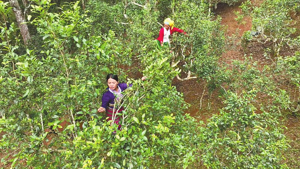 景迈山万亩古茶园内,“90后”布朗族茶农玉公砍和她的母亲正在采茶。 陆煜 摄