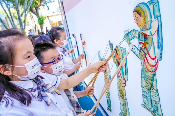 二年级的学生们准备了皮影戏《福娃的航天梦》片段,该片段改编自黄城根小学分校全体学生共同编写,由机械工业出版社出版的《福娃的航天梦》一书。该书开篇从《嫦娥奔月》的古老传说开始讲起,在睡梦中主人公福娃参观了航天员训练馆,见证了航天员们辛苦的训练,随后在训练馆麦叔叔的带领下,参观了航天员用品制造基地,并一起见证了飞船发射、空间站完善等等激动人心的事件。作为一本科普绘本,《福娃的航天梦》插图质朴,内容童真而写实。插图全是由黄城根小学分校一年级同学在老师的带领和帮助下,利用课余时间创作完成的;文字内容则是老师们向孩子们提问,引导孩子们口语表达,收集的一手文本素材,随后整理、组合完成。