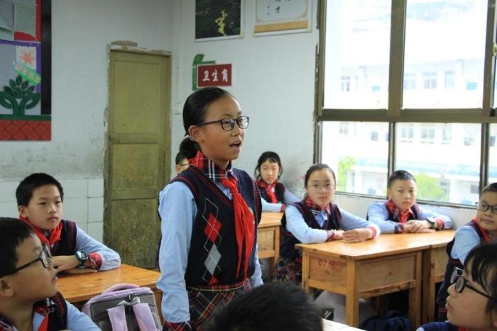 重庆石柱土家族自治县黄水小学六年级(2)班的开学主题班会上,余良玉同学正在大声说出新学年的努力目标。(受访者供图)