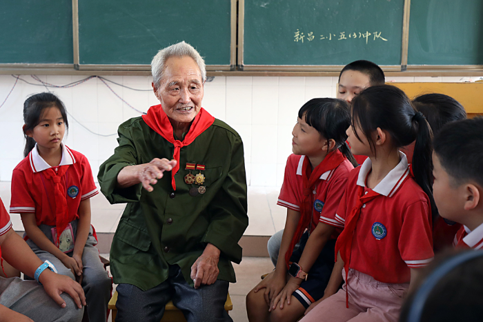 1日上午,江西省宜丰县新昌二小五年级(3)班的教室里,94岁的“一等功臣”、退役老兵陈学成,操着浓浓的乡音给学生们讲述他参加过的淮海战役、渡江战役等革命故事。