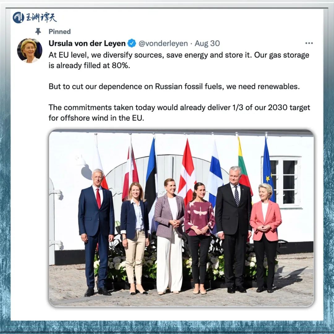 △欧盟委员会主席冯德莱恩在社交媒体上置顶了欧盟天然气储备率达标80%的消息,照片上从左至右依次是:拉脱维亚总理、爱沙尼亚总理、丹麦首相、芬兰总理、立陶宛总统、冯德莱恩。