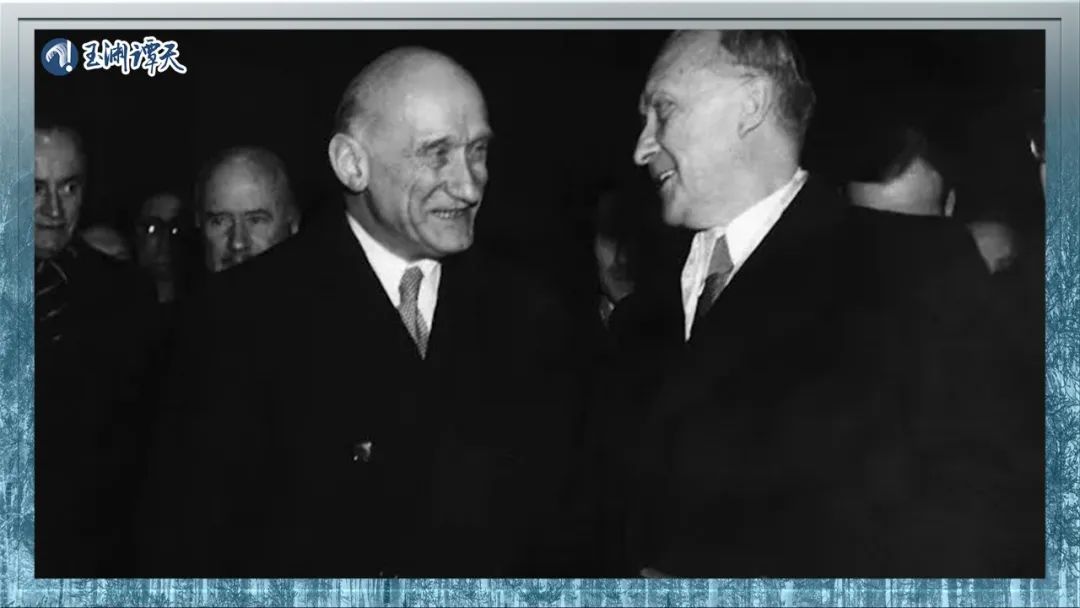 △1950年,时任德国总理阿登纳(右)接待来访的法国外交部长舒曼(左),战后法德和解,就煤钢生产及储备达成一致,是欧洲煤钢共同体得以成立的基础