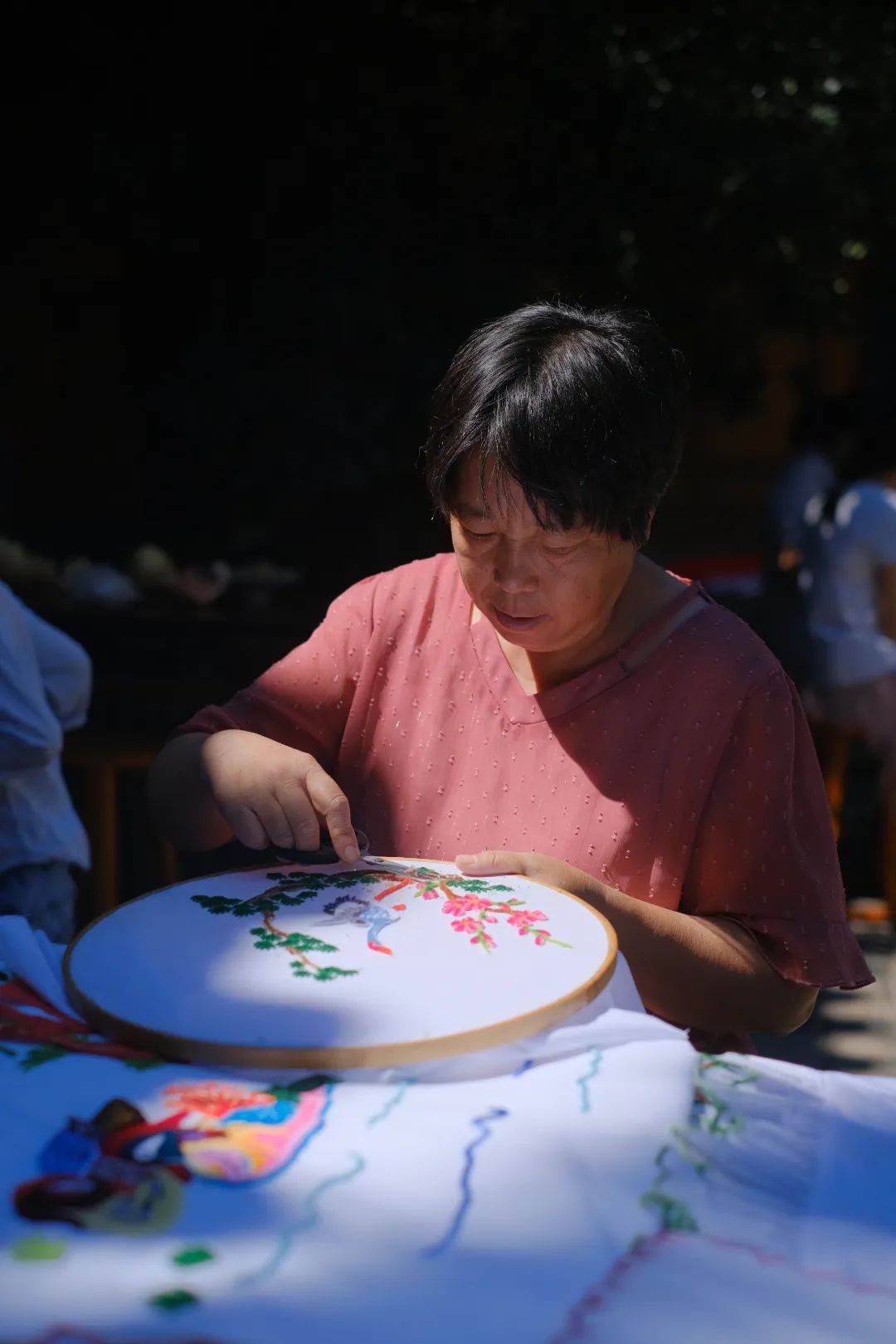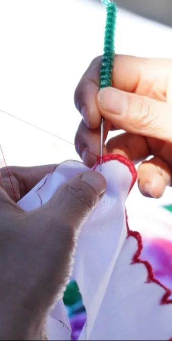 绣娘们趁着石榴尚未全面进入采摘期,聚在这里绣花,交流刺绣心得。