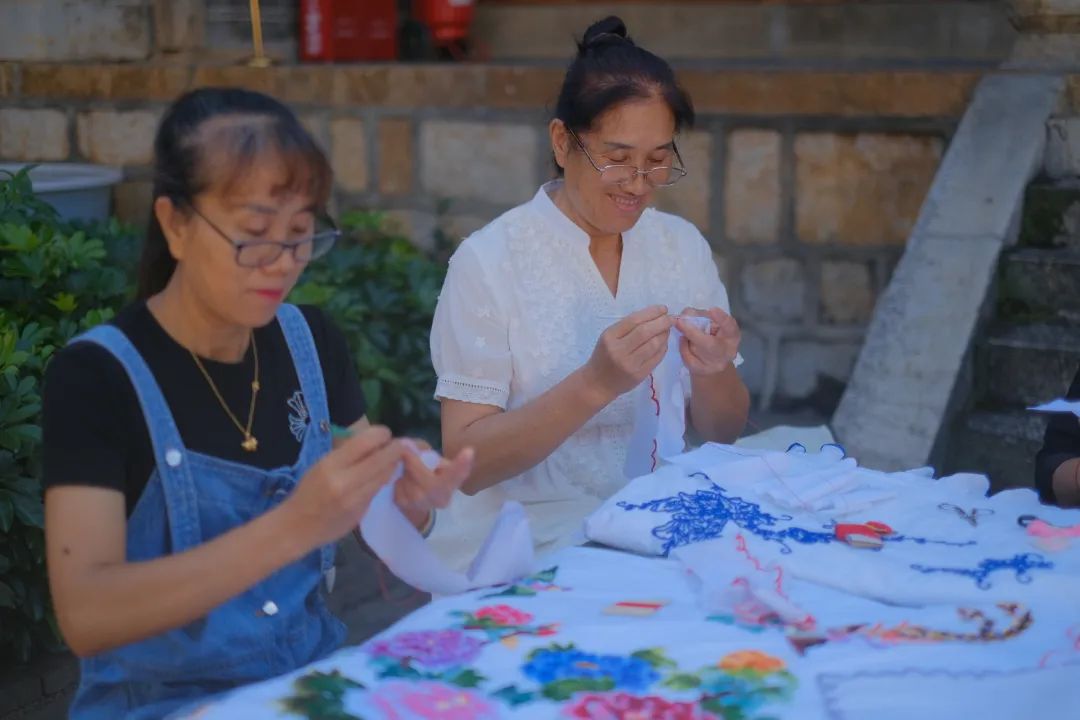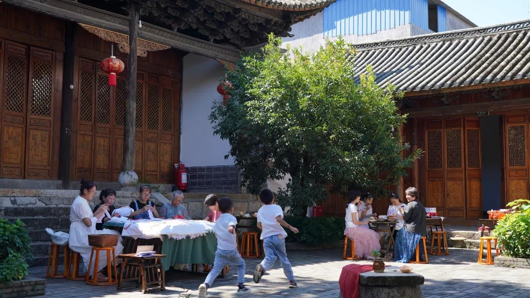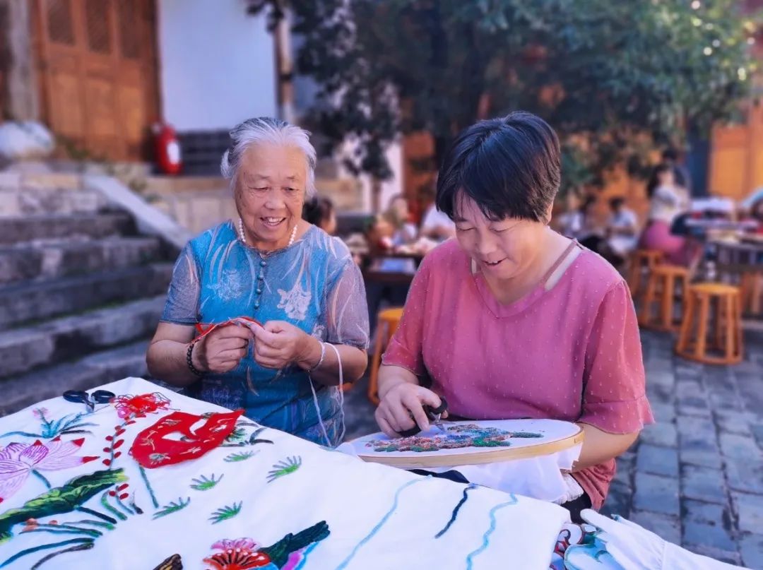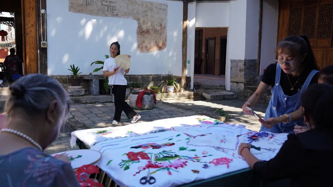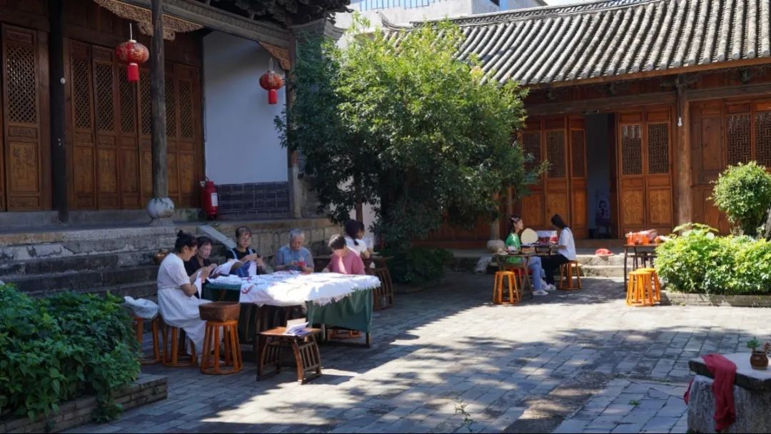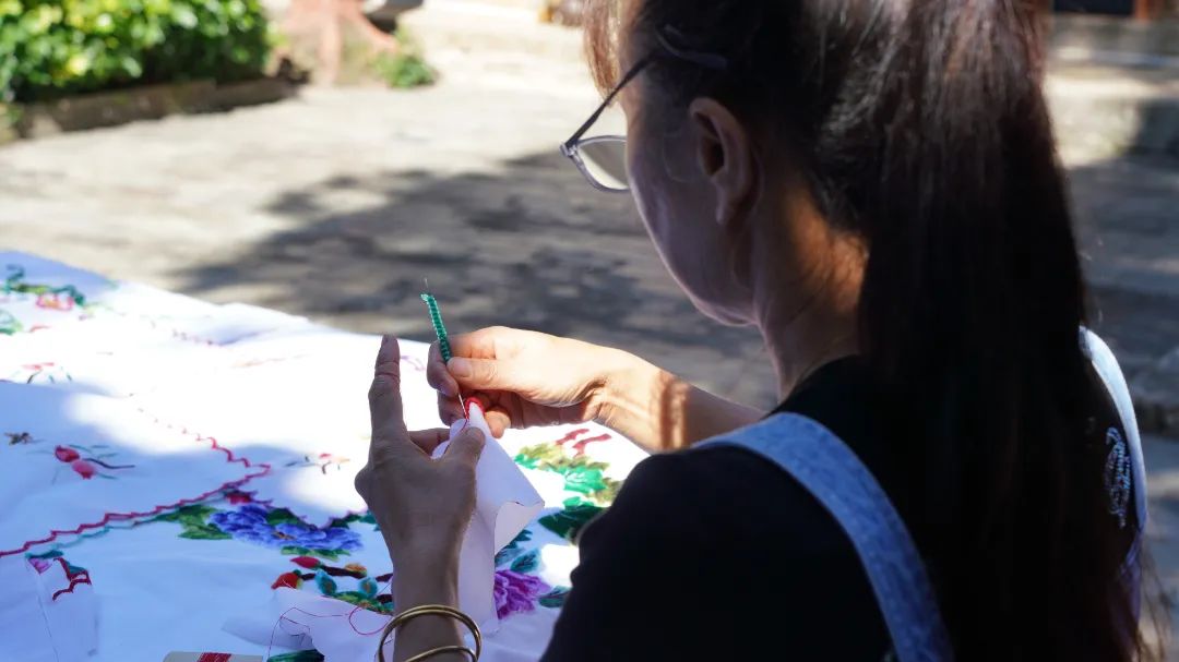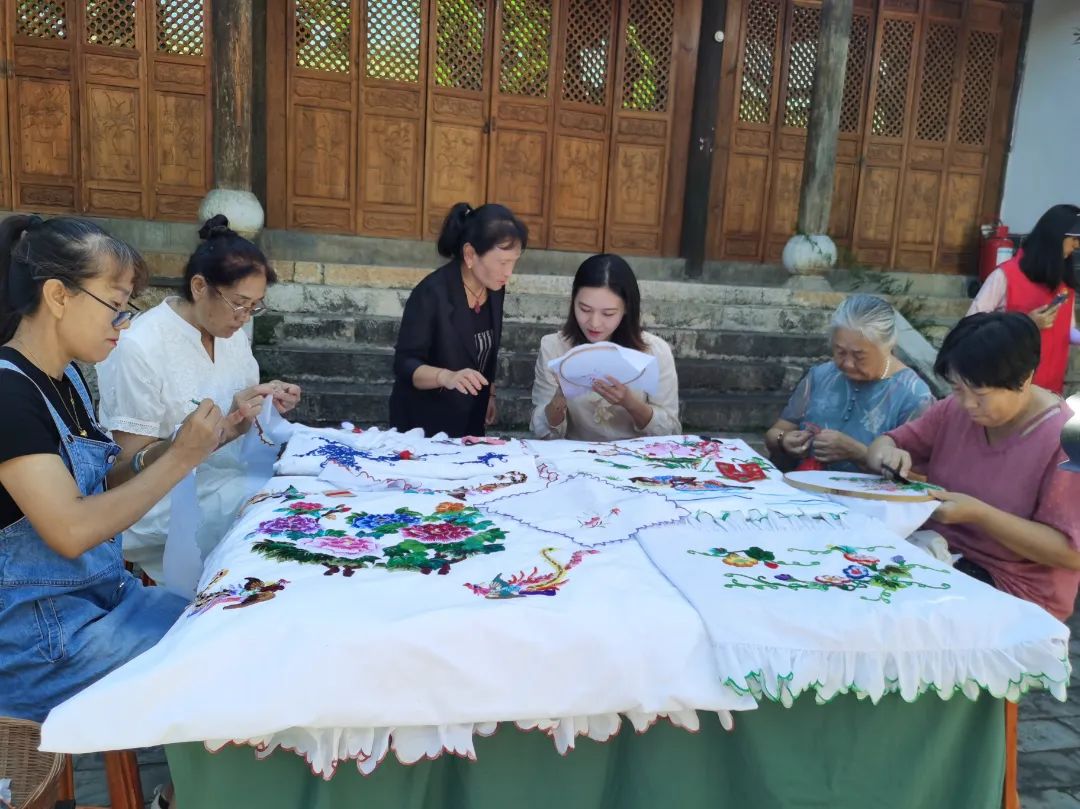 中秋前夕,在蒙自市新安所街道母亲学校里,青瓦屋檐下,鸟雀啁啾,古柏青苍。几个绣娘围坐在一起,边飞针走线,边轻声交谈着。