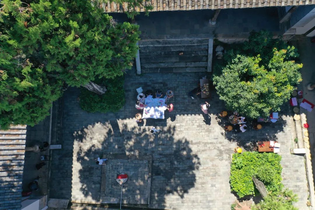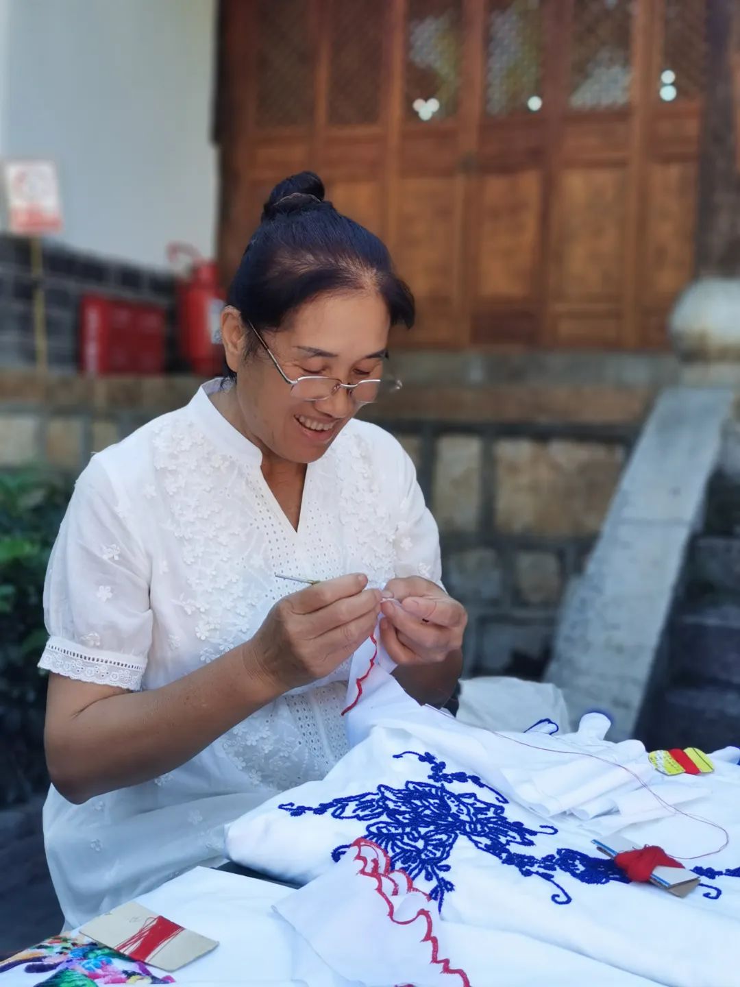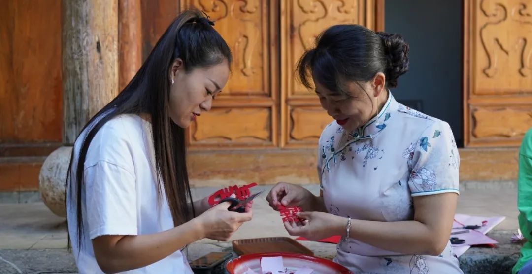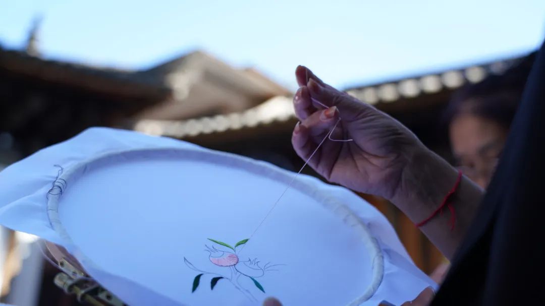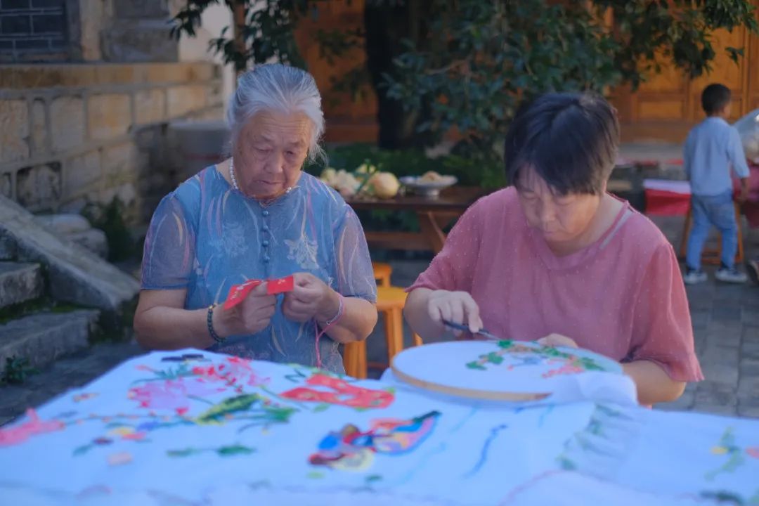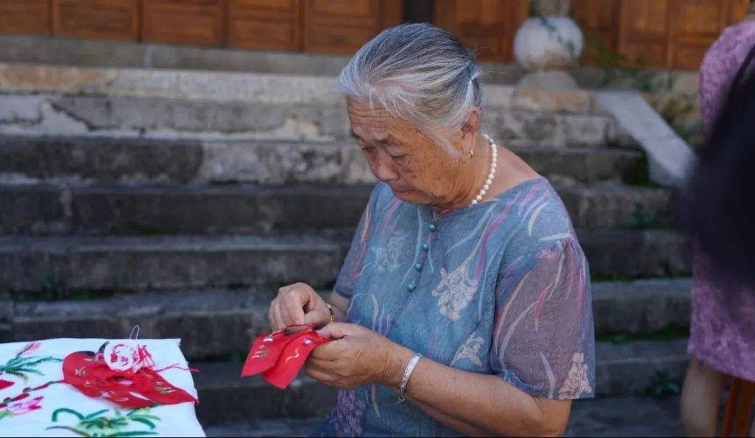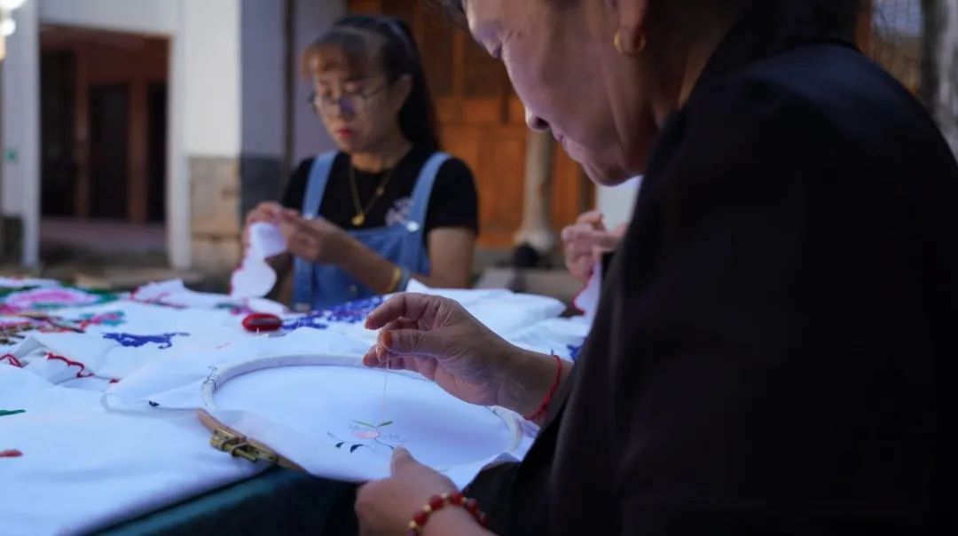 中秋前夕,在蒙自市新安所街道母亲学校里,青瓦屋檐下,鸟雀啁啾,古柏青苍。几个绣娘围坐在一起,边飞针走线,边轻声交谈着。