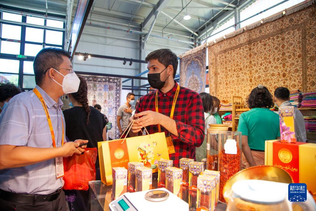 9月5日,观众(左)在服贸会首钢园区文旅服务专题展区伊朗展台购买商品。新华社记者 张帆 摄