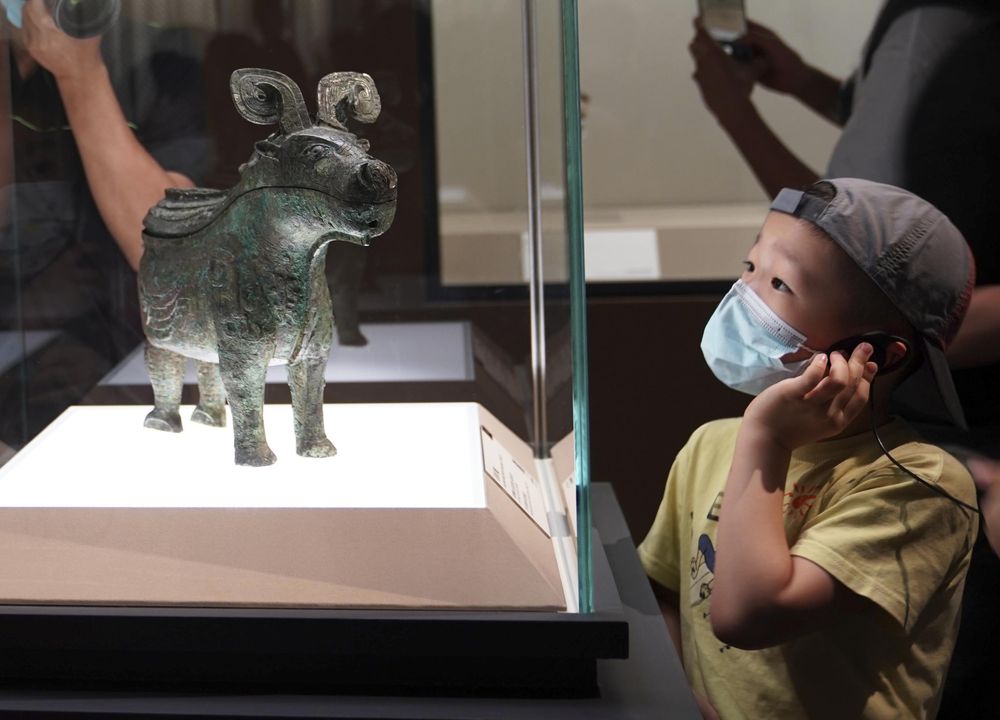 2022年7月30日,小观众在上海博物馆举行的“宅兹中国——河南夏商周三代文明展”上参观。新华社记者 任珑 摄