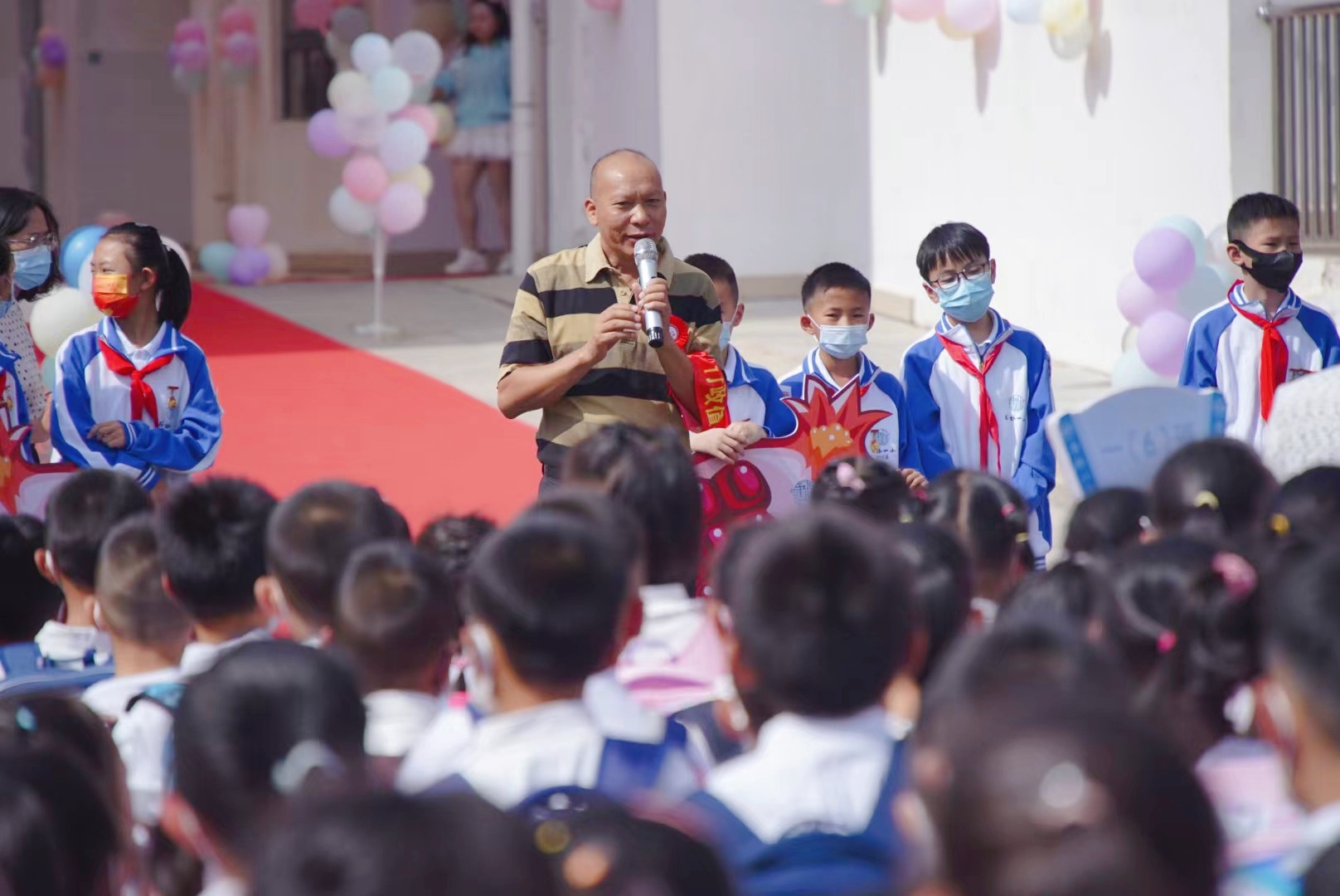 在入学仪式上,主持人杨清涵老师代表全校师生欢迎新生加入到书林一小这个温暖的大家庭里,并为他们送出温馨的寄语。学校领导和少先队大队委们,为新入学的同学们佩戴小红花,以此祝贺他们开启崭新的校园生活。